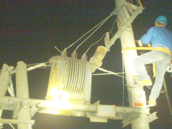 徐圩供電所立即派搶修人員趕到現(xiàn)場。海通攪拌站廠區(qū)事故現(xiàn)場,高壓桿傾斜,低壓桿折斷,變壓器高低壓樁頭全部歪曲,損壞嚴重,夜間無法修復。為盡快使其它線路恢復供電,搶修人員黑夜進行應急處理,折除了變壓器高壓引線,并作了妥善的安全保障。同時,加緊準備搶修材料、電桿及變電設備。